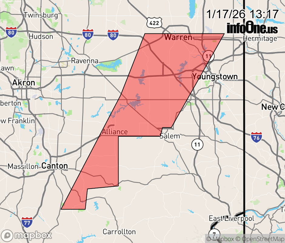 Canceled 1/17/26 1:45 PM Snow Squall Warning issued January 17 at 1:16PM EST until January 17 at 1:45PM EST by NWS Cleveland OH The National Weather Service in Cleveland has issued a * Snow Squall Warning for... Southern Trumbull County in northeastern Ohio... Southeastern Portage County in northeastern Ohio... Western Mahoning County in northeastern Ohio... Eastern Stark County in northeastern Ohio... * Until 145 PM EST. * At 115 PM EST, a dangerous snow squall was located along a line extending from near Leavittsburg to 8 miles south of Newton Falls to near Waynesburg, moving northeast at 35 mph. HAZARD...Intense bursts of heavy snow. Gusty winds leading to blowing snow and visibility rapidly falling to less than one-quarter mile. Wind gusts up to 35 mph. SOURCE...Radar and webcams. IMPACT...Travel will become difficult and potentially dangerous within minutes. This will affect portions of I-80, I-76, I-680 and US 422 in Mahoning and southern Trumbull Counties. Locations impacted include... Youngstown, Warren, Alliance, Niles, Canfield, Newton Falls, Sebring, Minerva, Lordstown, Waynesburg, Hilltop, Leavittsburg, Vienna Center, Austintown, Girard, McDonald, Ellsworth, Craig Beach, Beloit, and Deerfield. ![]() |