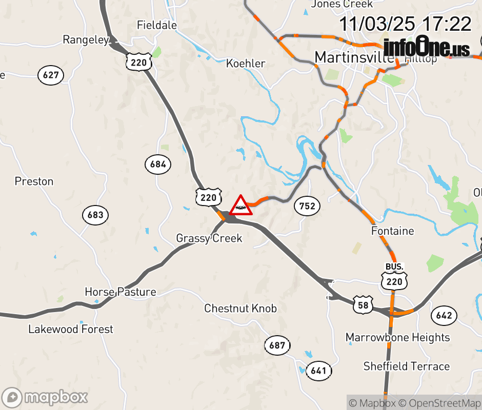 On BUS US-58 West in the County of Henry, in the vicinity of Summit Rd; Rt. 1746N/S (Henry County), motorists can expect delays due to a vehicle crash. Lane closures exist. ![]() |