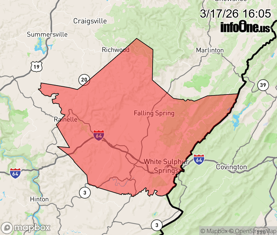 Canceled 3/17/26 4:50 PM Winter Weather Advisory issued March 17 at 4:03PM EDT until March 17 at 5:00PM EDT by NWS Blacksburg VA * WHAT... Snow. Additional snow accumulations up to one inch. Winds gusting as high as 35 mph. * WHERE... Western Greenbrier County. * WHEN... Until 5 PM EDT this afternoon. * IMPACTS... Plan on slippery road conditions. The hazardous conditions could impact the Tuesday evening commute. ![]() |