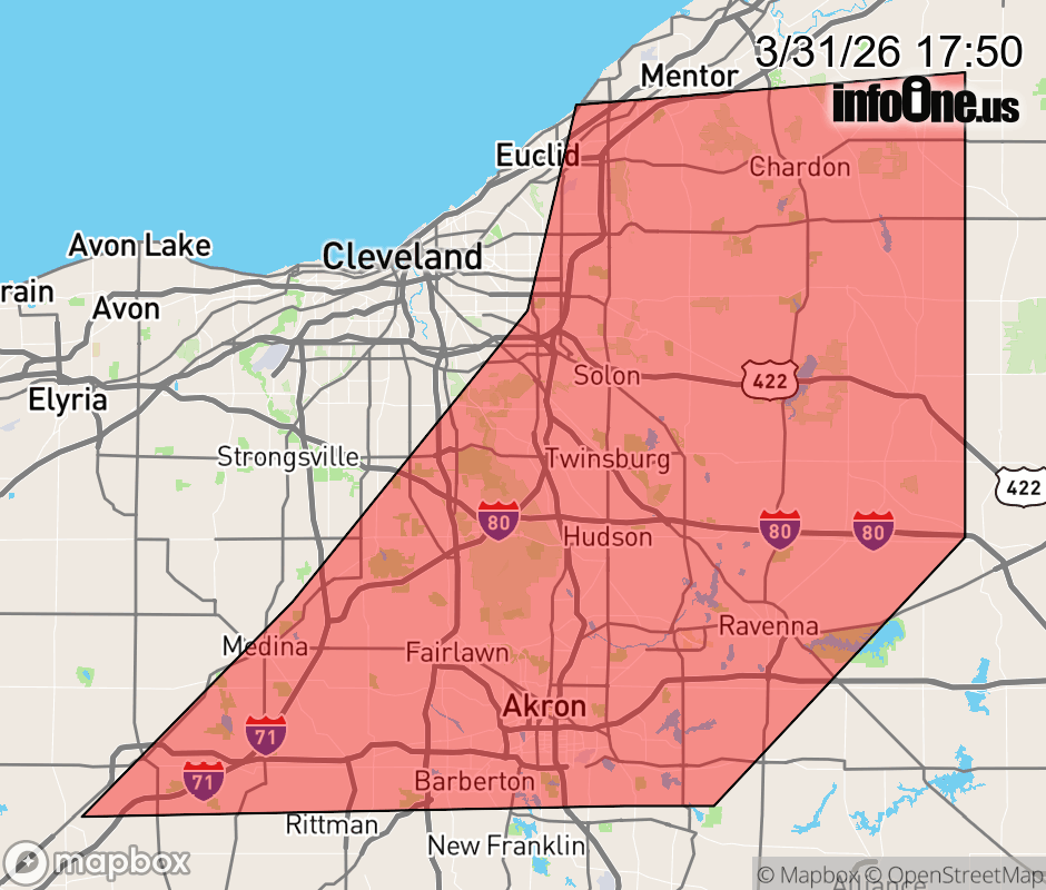 Canceled 3/31/26 6:15 PM Severe Thunderstorm Warning issued March 31 at 5:49PM EDT until March 31 at 6:15PM EDT by NWS Cleveland OH At 548 PM EDT, severe thunderstorms were located along a line extending from near Chesterland to Hudson to Rittman, moving east at 65 mph. HAZARD...70 mph wind gusts and penny size hail. SOURCE...Radar indicated. IMPACT...Expect considerable tree damage. Damage is likely to mobile homes, roofs, and outbuildings. Locations impacted include... Akron, Medina, Willowick, Ravenna, Chardon, Cuyahoga Falls, Euclid, Mentor, North Royalton, Kent, Barberton, Solon, Willoughby, Hudson, Wadsworth, Twinsburg, Eastlake, Tallmadge, Streetsboro, and Warrensville Heights. ![]() |
