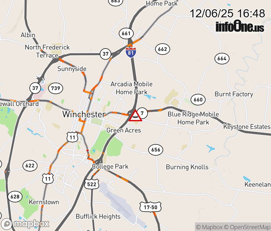 On VA-7 in the County of Frederick, in the vicinity of the ramp from and to I-81N, motorists can expect delays due to a vehicle crash. The east right lane and right shoulder are closed. ![]() |
