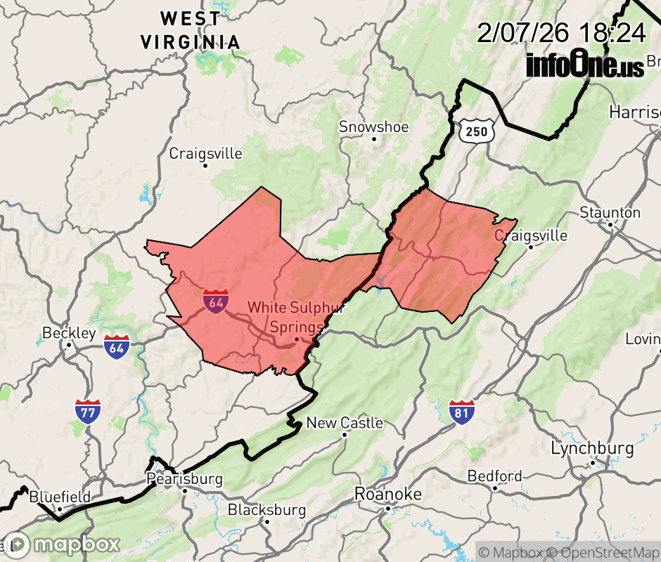 Canceled 2/8/26 4:22 AM Extreme Cold Warning issued February 7 at 6:23PM EST until February 8 at 7:00AM EST by NWS Blacksburg VA * WHAT... Dangerously cold wind chills as low as 15 below. * WHERE... In Virginia, Bath County. In West Virginia, Western Greenbrier County. * WHEN... Until 7 AM EST Sunday. * IMPACTS... The cold wind chills as low as 15 below zero could result in hypothermia or frostbite if precautions are not taken. Frostbite and hypothermia will occur if unprotected skin is exposed to these temperatures. ![]() |