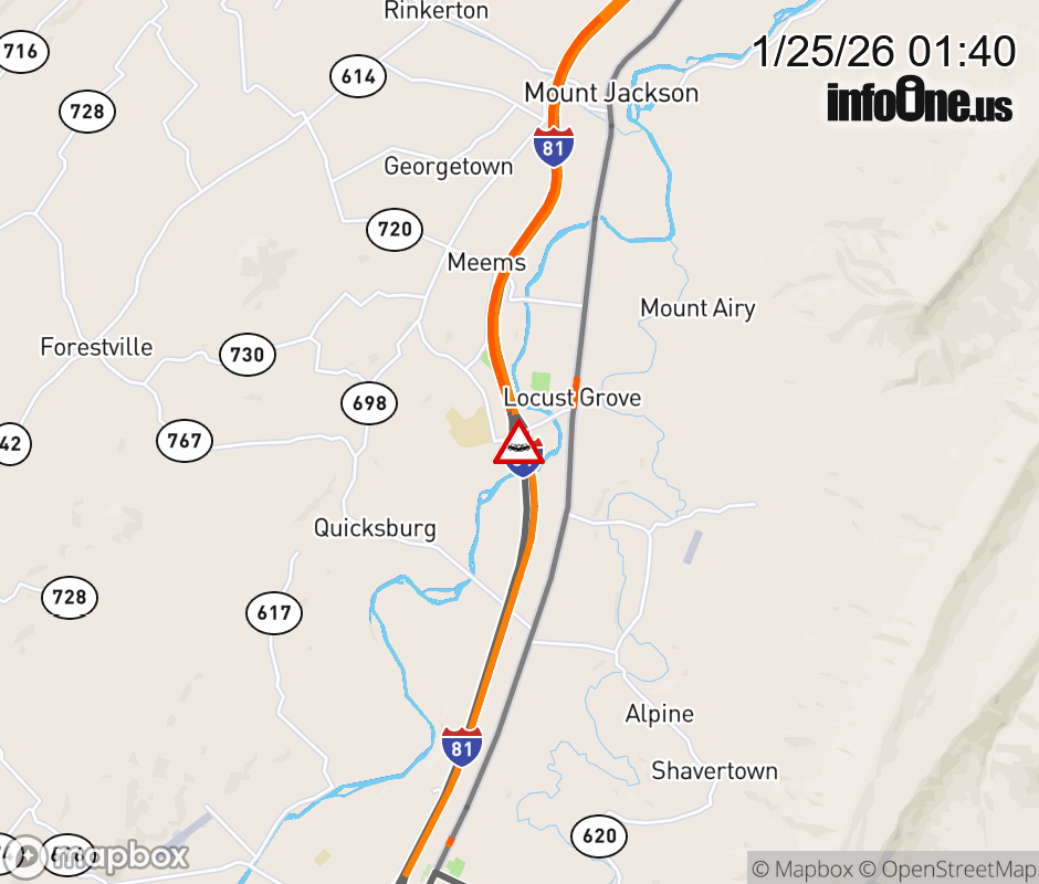 On I-81 at mile marker 269 in the County of Shenandoah, motorists can expect delays due to a vehicle crash. The south exit ramp narrows. Updated: Sun 1/25/26 1:40 AM EST ![]() Updated: Sun 1/25/26 1:40 AM EST |