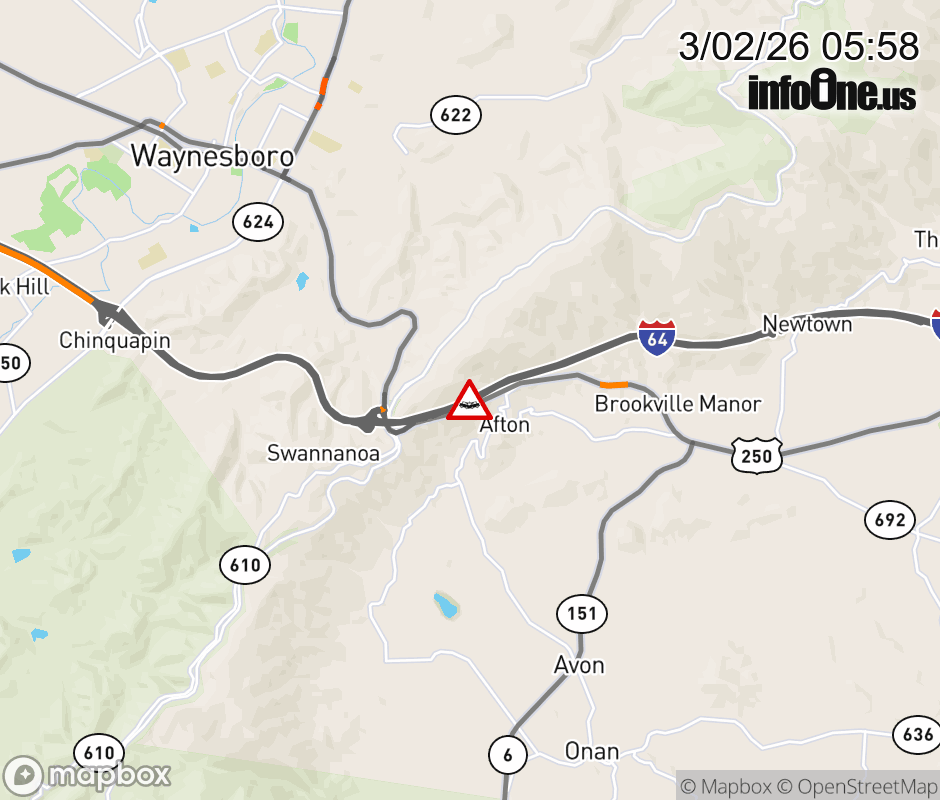 On I-64 at mile marker 100.6 in the County of Albemarle, motorists can expect delays due to a vehicle crash. The west left shoulder and left lane are closed. ![]() |