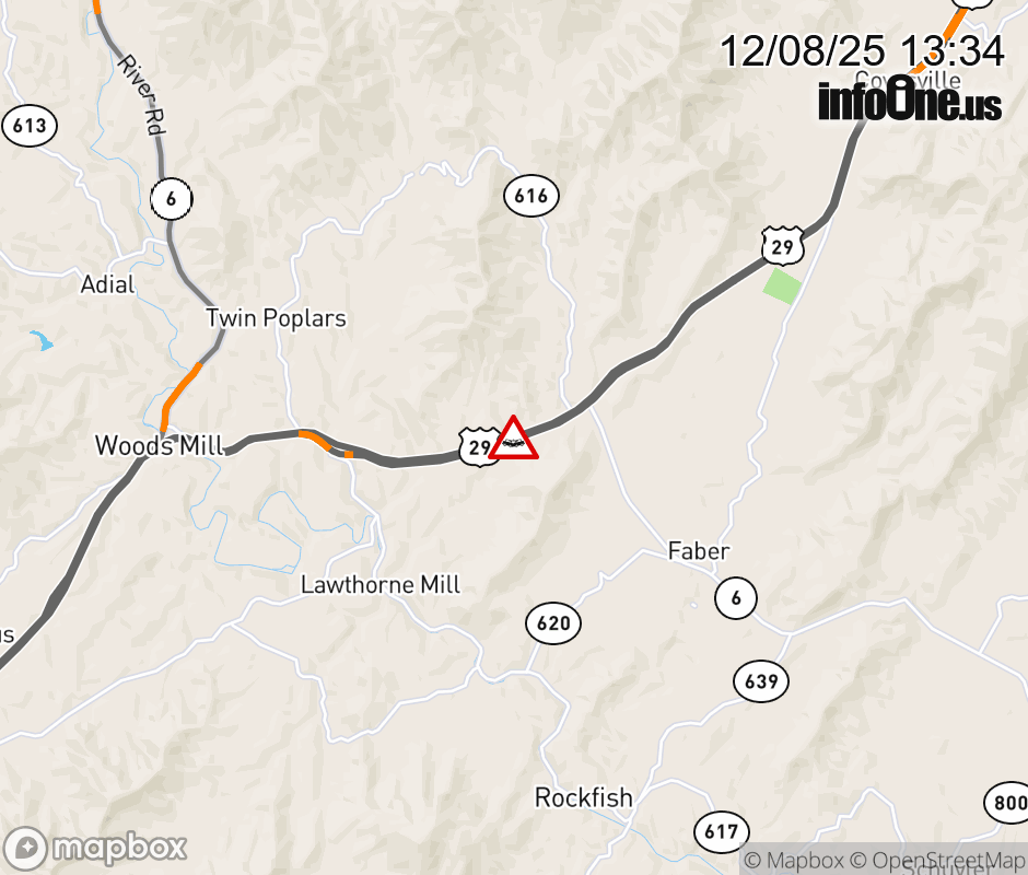 On US-29 in the County of Nelson, in the vicinity of Jackson Ln; Rt. 837N/S (Nelson County), motorists can expect delays due to a vehicle crash. The south right lane and right shoulder are closed. ![]() |