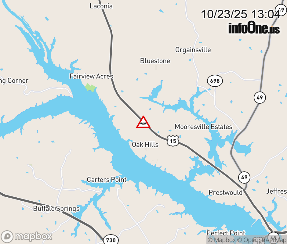 On US-15 North in the County of Mecklenburg, in the vicinity of Oak Hill Dr; Whitetail Rd; Rt. 859E/W (Mecklenburg County); Rt. 858E/W (Mecklenburg County), motorists can expect delays due to a vehicle crash. Lane closures exist. ![]() |