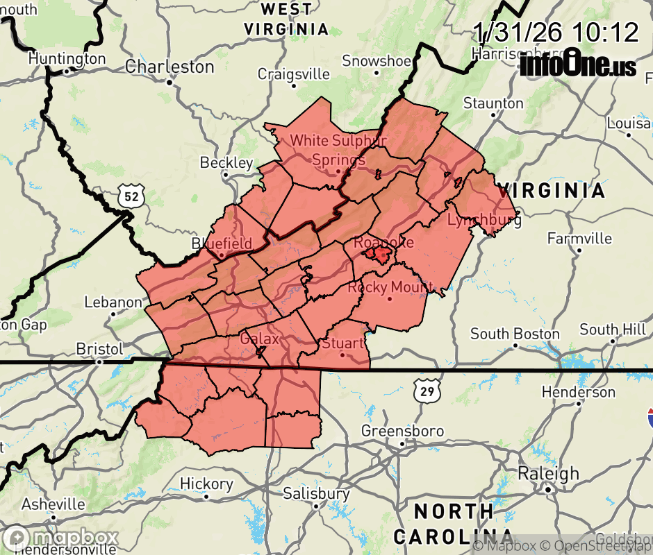 Canceled 1/31/26 11:38 AM Extreme Cold Warning issued January 31 at 10:10AM EST until February 1 at 1:00PM EST by NWS Blacksburg VA * WHAT... Dangerously cold wind chills as low as 15 below expected. * WHERE... Portions of north central and northwest North Carolina, central, south central, southwest, and west central Virginia, and southeast West Virginia. * WHEN... Until 1 PM EST Sunday. * IMPACTS... The dangerously cold wind chills as low as 20 below zero could result in hypothermia or frostbite if precautions are not taken. Frostbite and hypothermia will occur if unprotected skin is exposed to these temperatures. ![]() |