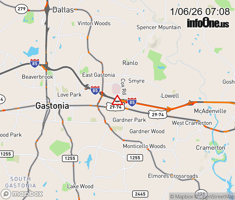 The left lane is closed at Exit 21 (Cox Rd.). DMS: D12-11, 12, 13 ![]() |