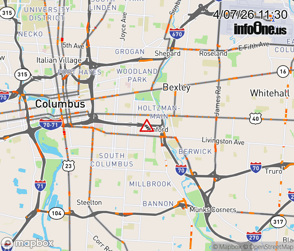 The 2 left lanes are blocked on I-70 East beyond Miller Ave/Kelton Ave, due to debris on roadway. Updated: Tue 4/7/26 11:30 AM EDT ![]() Updated: Tue 4/7/26 11:30 AM EDT |