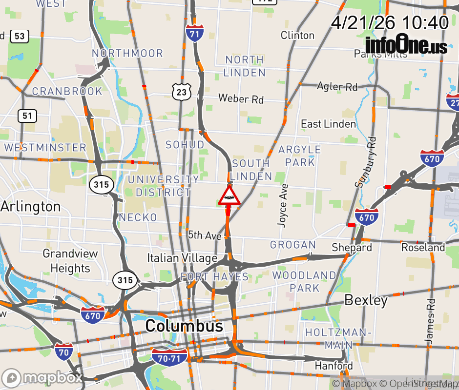 The right shoulder is blocked on I-71 North at 17th Ave, due to a crash. Updated: Tue 4/21/26 10:40 AM EDT ![]() Updated: Tue 4/21/26 10:40 AM EDT |