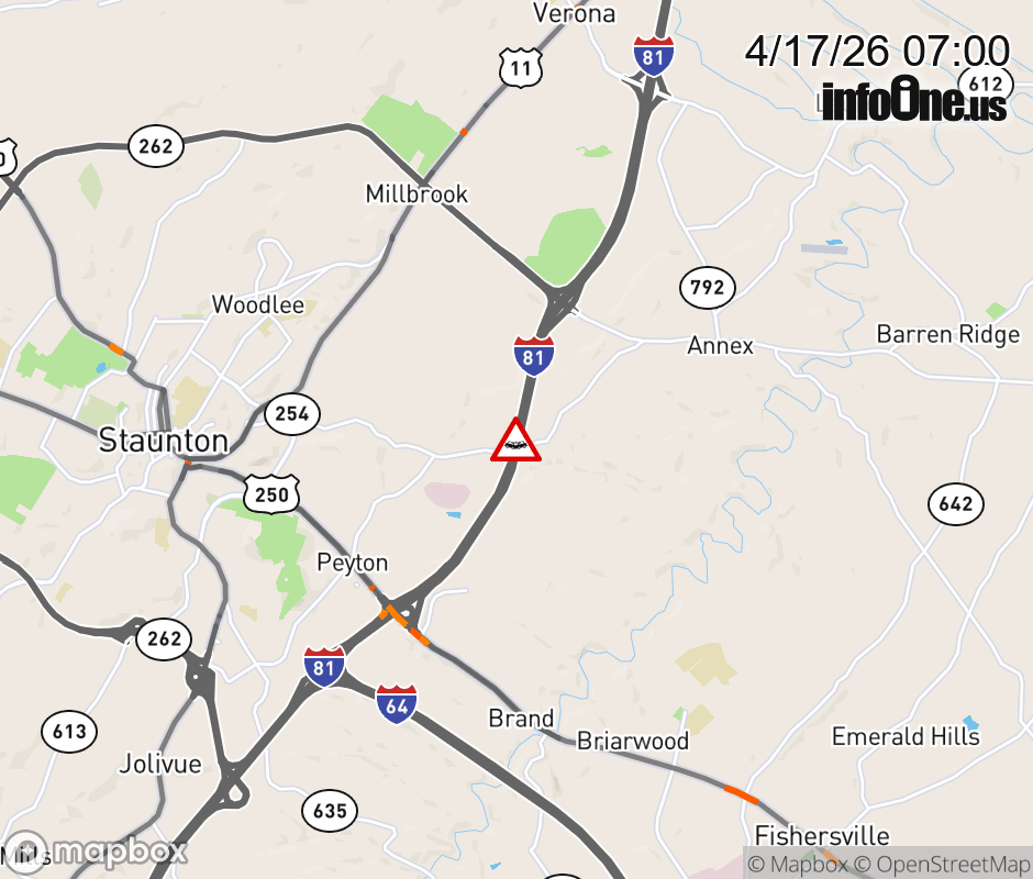 On I-81 at mile marker 224.4 in the County of Augusta, motorists can expect delays due to a vehicle crash. The south right shoulder is closed. Updated: Fri 4/17/26 7:00 AM EDT ![]() Updated: Fri 4/17/26 7:00 AM EDT |