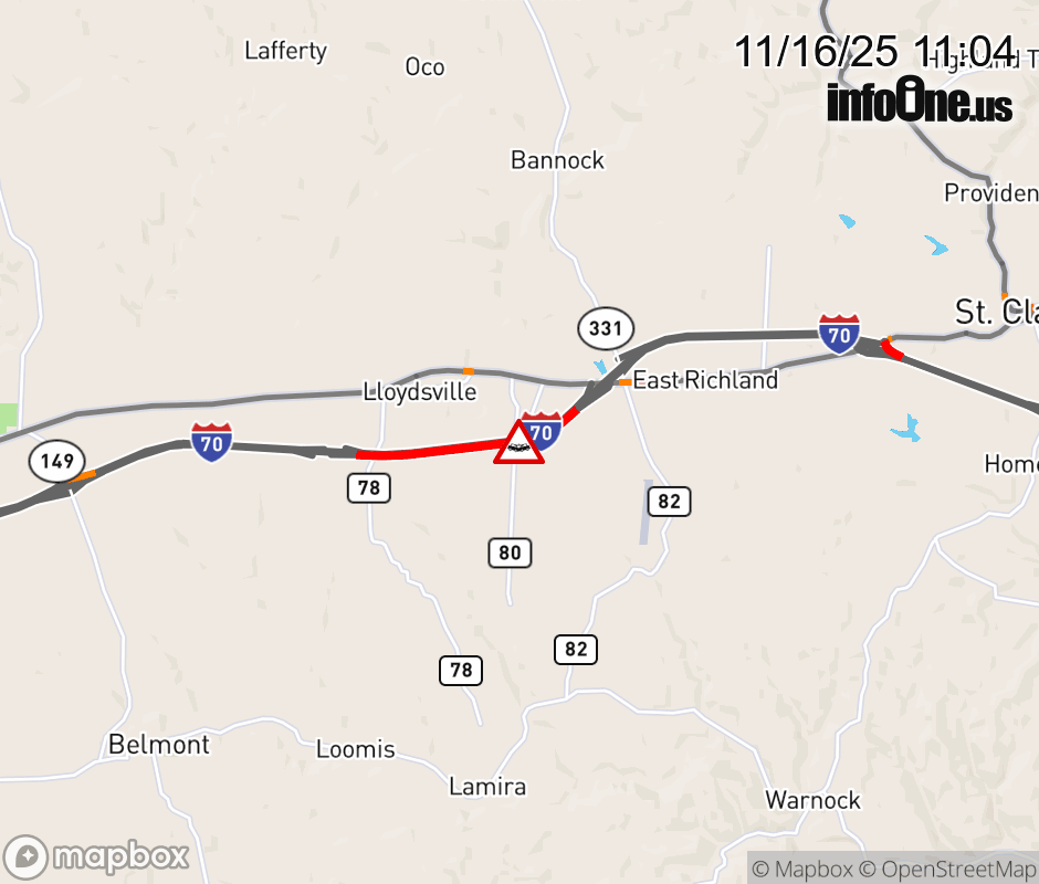 The right lane is blocked on I-70 East beyond Belmont County Rest Area 11-25, due to a crash. Updated: Sun 11/16/25 11:04 AM EST ![]() Updated: Sun 11/16/25 11:04 AM EST |