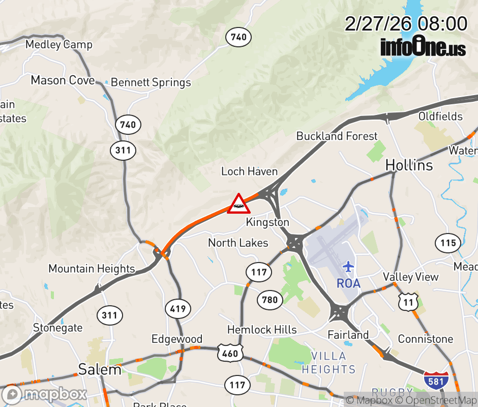 On I-81 at mile marker 143.2 in the County of Roanoke, motorists can expect delays due to a vehicle crash. The north left shoulder is closed. The south left shoulder is closed. Updated: Fri 2/27/26 8:00 AM EST ![]() Updated: Fri 2/27/26 8:00 AM EST |
