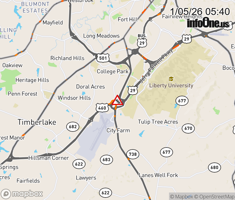 On BUS US-29 in the County of Campbell, in the vicinity of Ramp Intersection:TO RT 460 WEST, motorists can expect delays due to a vehicle fire. All south lanes are closed. ![]() |