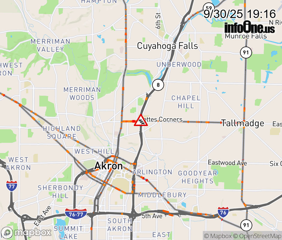 The left lane is blocked on SR-8 North/SR-59 East beyond SR-261/Tallmadge Ave, due to repairs/maintenance. ![]() |