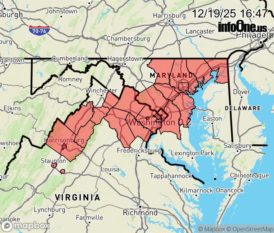 Canceled 12/19/25 6:36 PM Wind Advisory issued December 19 at 4:46PM EST until December 19 at 10:00PM EST by NWS Baltimore MD/Washington DC * WHAT... West winds 15 to 25 mph with gusts up to 50 mph. * WHERE... Portions of DC, central, north central, northeast, and northern Maryland, and northern, northwest, and western Virginia. * WHEN... Until 10 PM EST this evening. * IMPACTS... Gusty winds will blow around unsecured objects. Tree limbs could be blown down and a few power outages may result. ![]() |