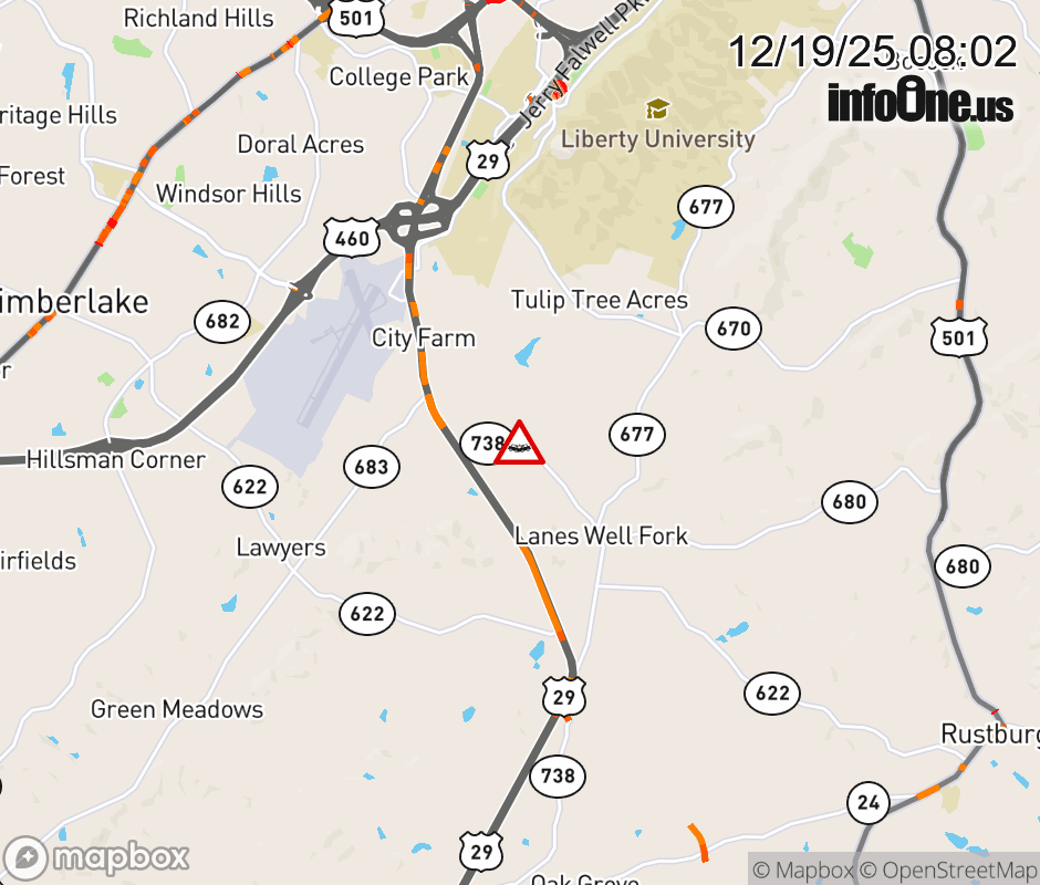 On Rt. 738 in the County of Campbell, in the vicinity of Wards Rd; US-29N, motorists can expect delays due to a vehicle crash. All north lanes are closed. All south lanes are closed. ![]() |