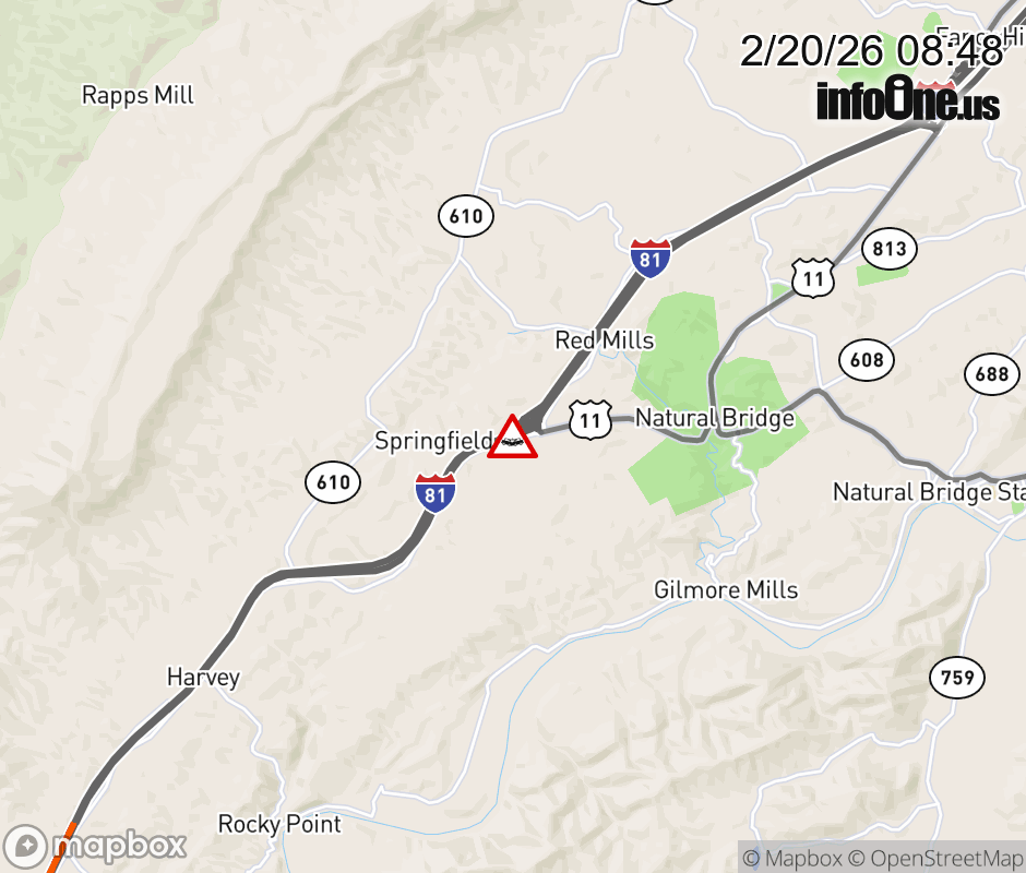 On I-81 North at mile marker 175.8 in the County of Rockbridge, motorists can expect delays due to a vehicle crash. Updated: Fri 2/20/26 8:48 AM EST ![]() Updated: Fri 2/20/26 8:48 AM EST |