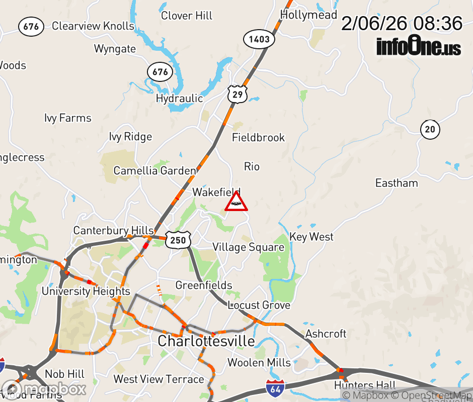 On Rt. 631 in the County of Albemarle, in the vicinity of Greenbrier Dr; City Rt. 3431N/S (City of Charlottesville); County/City/Town Line: CHARLOTTESVILLE, motorists can expect delays due to a vehicle crash. All north lanes are closed. All south lanes are closed. Updated: Fri 2/6/26 8:36 AM EST ![]() Updated: Fri 2/6/26 8:36 AM EST |