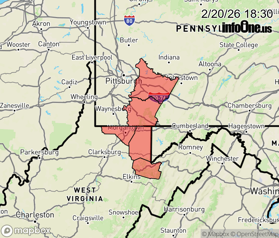Canceled 2/21/26 2:11 AM Winter Storm Watch issued February 20 at 6:28PM EST until February 24 at 1:00AM EST by NWS Pittsburgh PA * WHAT... An extended period of snow for high terrain. More than 6 inches of snow is favored for Sunday through Monday. * WHERE... Portions of southwest Pennsylvania and northern West Virginia. * WHEN... From late Saturday night through late Monday night. * IMPACTS... Travel could be very difficult. The hazardous conditions could impact the Monday morning commute. * ADDITIONAL DETAILS... Highest accumulations are most likely for grassy surfaces in the high terrain. Snow totals may vary largely from valleys to ridgetops. Snow most likely to stick to roads and sidewalks Sunday night. ![]() |