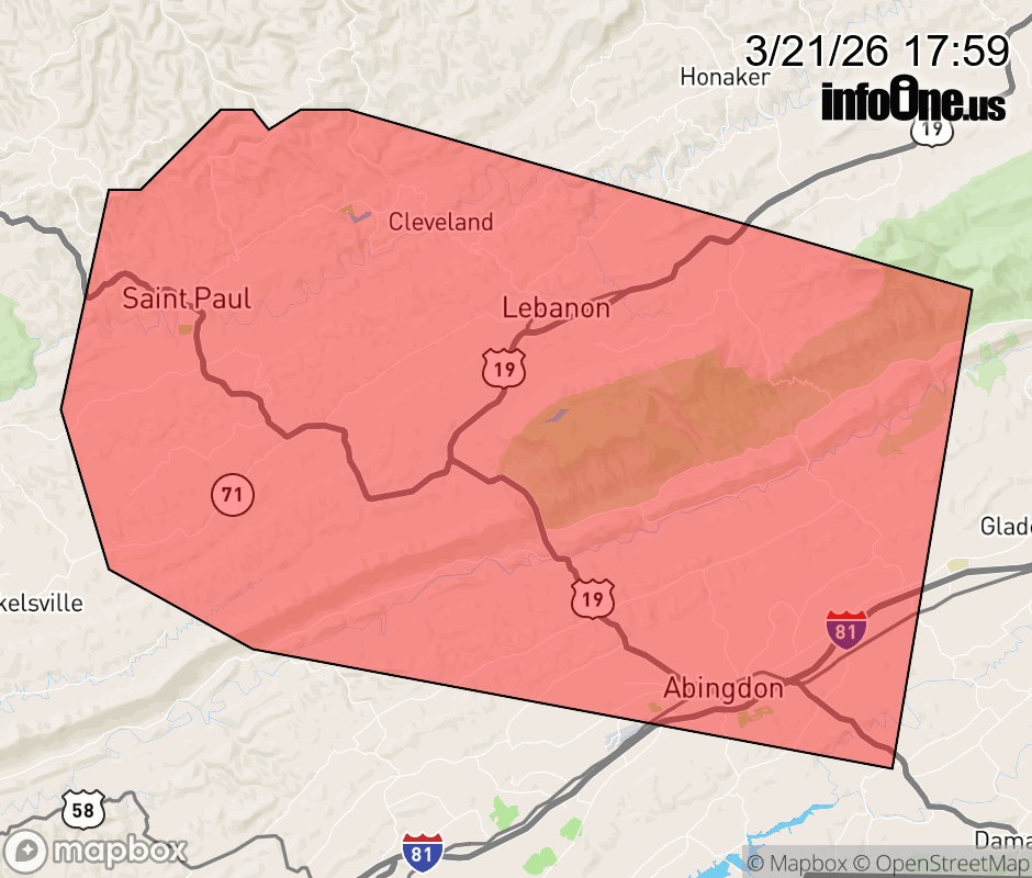 Canceled 3/21/26 7:00 PM Special Weather Statement issued March 21 at 5:57PM EDT by NWS Morristown TN At 557 PM EDT, Doppler radar was tracking a strong thunderstorm 9 miles southwest of Cleveland Va, or 12 miles west of Lebanon, moving east at 30 mph. HAZARD...Winds in excess of 30 mph and half inch hail. SOURCE...Radar indicated. IMPACT...Gusty winds could knock down tree limbs and blow around unsecured objects. Minor hail damage to vegetation is possible. Locations impacted include... Abingdon, Lebanon, Cleveland Va, St. Paul, Lindell, Castlewood, Holston, Emory-Meadowview, and Hansonville. ![]() |