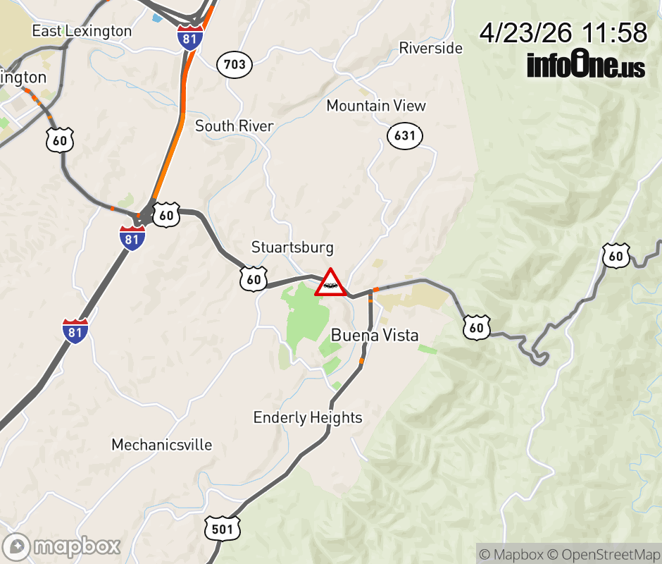 On US-60 in the County of Rockbridge, in the vicinity of Orchard Ave; W 29th St; County/City/Town Line: BUENA VISTA, motorists can expect delays due to a vehicle crash. The west right lane and right shoulder are closed. ![]() |
