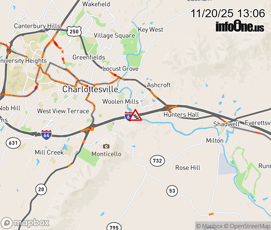 On I-64 West at mile marker 123.4 in the County of Albemarle, motorists can expect delays due to congestion. Updated: Thu 11/20/25 1:06 PM EST ![]() Updated: Thu 11/20/25 1:06 PM EST |
