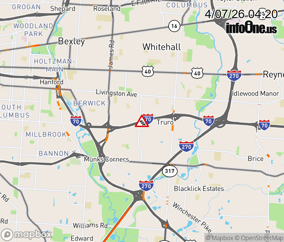 The 2 left lanes are blocked on I-70 West beyond SR-317/Hamilton Rd, due to repairs/maintenance. Updated: Tue 4/7/26 4:20 AM EDT ![]() Updated: Tue 4/7/26 4:20 AM EDT |