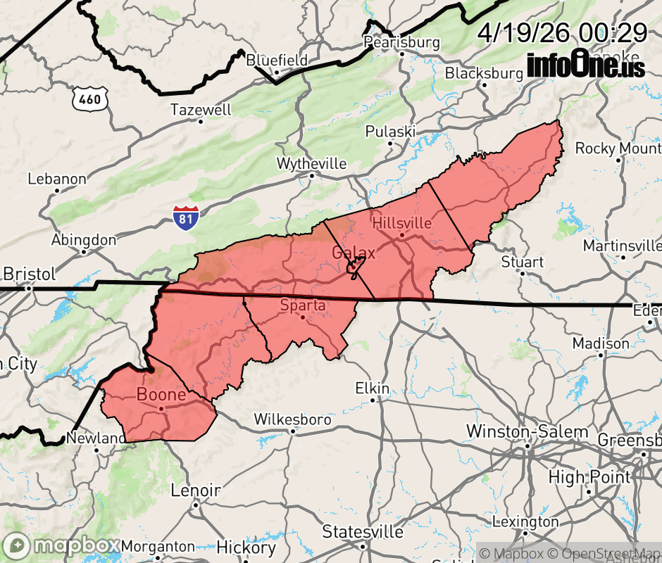 Canceled 4/19/26 1:28 PM Wind Advisory issued April 19 at 12:28AM EDT until April 19 at 4:00PM EDT by NWS Blacksburg VA * WHAT... Northwest winds 20 to 30 mph with gusts up to 50 mph expected, especially along the higher ridges. * WHERE... In North Carolina, Alleghany NC, Ashe, and Watauga Counties. In Virginia, Carroll, Floyd, and Grayson Counties. * WHEN... From 6 AM this morning to 4 PM EDT this afternoon. * IMPACTS... Gusty winds will blow around unsecured objects. Tree limbs could be blown down and a few power outages may result. ![]() |