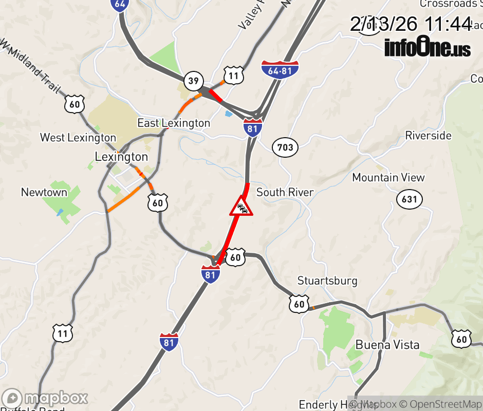 On I-81 North at mile marker 189.8 in the County of Rockbridge, motorists can expect delays due to a vehicle fire. Traffic backups are approximately 2.0 miles. Updated: Fri 2/13/26 11:44 AM EST ![]() Updated: Fri 2/13/26 11:44 AM EST |