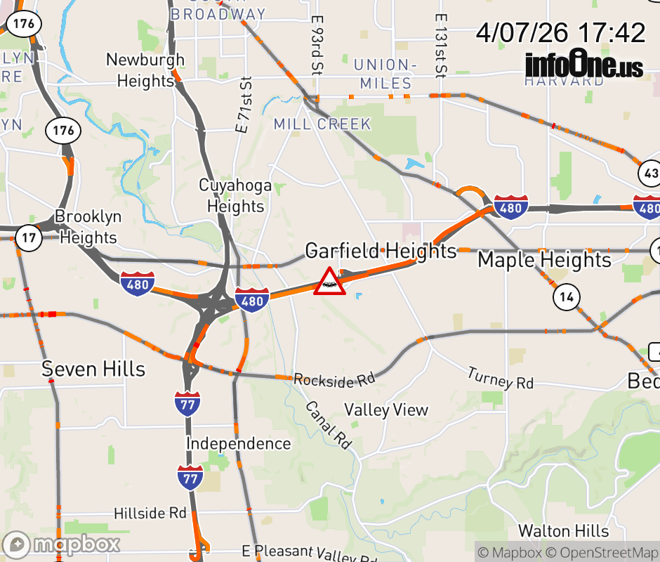 The left lane is blocked on I-480 West beyond Transportation Blvd/E 98th St, due to a crash. Updated: Tue 4/7/26 5:42 PM EDT ![]() Updated: Tue 4/7/26 5:42 PM EDT |