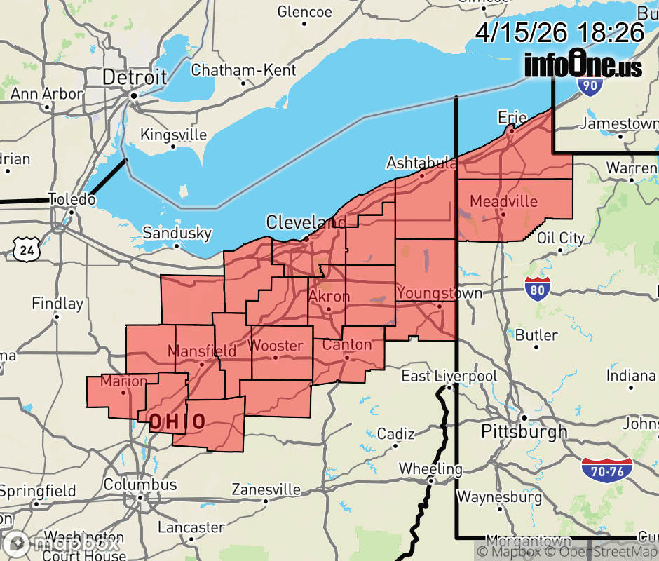 Canceled 4/15/26 7:58 PM Severe Thunderstorm Watch issued April 15 at 6:25PM EDT until April 15 at 9:00PM EDT by NWS Cleveland OH SEVERE THUNDERSTORM WATCH 120 REMAINS VALID UNTIL 9 PM EDT THIS EVENING FOR THE FOLLOWING AREAS IN OHIO THIS WATCH INCLUDES 20 COUNTIES IN NORTH CENTRAL OHIO ASHLAND CRAWFORD HURON KNOX LORAIN MARION MORROW RICHLAND IN NORTHEAST OHIO ASHTABULA CUYAHOGA GEAUGA HOLMES LAKE MAHONING MEDINA PORTAGE STARK SUMMIT TRUMBULL WAYNE IN PENNSYLVANIA THIS WATCH INCLUDES 2 COUNTIES IN NORTHWEST PENNSYLVANIA CRAWFORD ERIE THIS INCLUDES THE CITIES OF AKRON, ALLIANCE, ASHLAND, ASHTABULA, AURORA, AUSTINTOWN, AVON LAKE, BAINBRIDGE, BOARDMAN, BRUNSWICK, BUCYRUS, BURTON, CANTON, CARDINGTON, CHARDON, CHESTERLAND, CLEVELAND, CONNEAUT, CRESTLINE, EASTLAKE, ELYRIA, ERIE, GALION, GENEVA, KENT, KILLBUCK, LORAIN, MANSFIELD, MARION, MASSILLON, MEADVILLE, MEDINA, MENTOR, MIDDLEFIELD, MILLERSBURG, MOUNT GILEAD, MOUNT VERNON, NILES, NORTH RIDGEVILLE, NORWALK, ORRVILLE, PAINESVILLE, RAVENNA, RITTMAN, SOUTH RUSSELL, STREETSBORO, TITUSVILLE, WADSWORTH, WARREN, WICKLIFFE, WILLARD, WILLOUGHBY, WILLOWICK, WOOSTER, AND YOUNGSTOWN. ![]() |