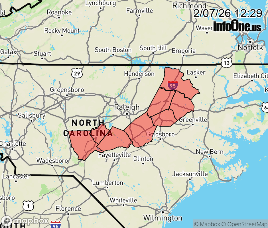 Cold Weather Advisory issued February 7 at 12:27PM EST until February 8 at 10:00AM EST by NWS Raleigh NC * WHAT... For the Wind Advisory, northwest winds 15 to 25 mph with gusts up to 45 mph expected through this afternoon. For the Cold Weather Advisory, very cold wind chills near 10 degrees expected late tonight into Sunday morning. * WHERE... Edgecombe, Halifax, Harnett, Johnston, Lee, Moore, Nash, and Wilson Counties. * WHEN... For the Wind Advisory, until 7 PM EST this evening. For the Cold Weather Advisory, from 11 PM this evening to 10 AM EST Sunday. * IMPACTS... Gusty winds will blow around unsecured outdoor objects. Tree limbs could be blown down and result in scattered power outages. Dangerously cold wind chills could result in hypothermia if precautions are not taken. ![]() |