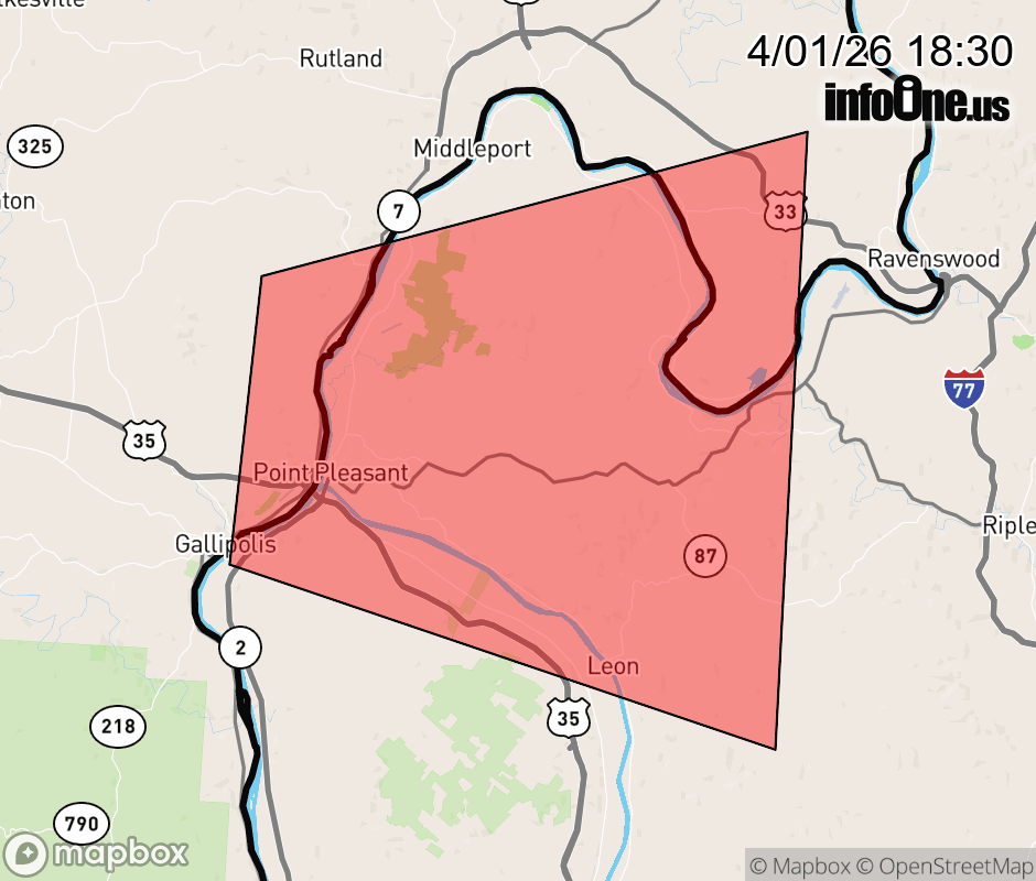 Canceled 4/1/26 6:45 PM Severe Thunderstorm Warning issued April 1 at 6:29PM EDT until April 1 at 6:45PM EDT by NWS Charleston WV At 628 PM EDT, a severe thunderstorm was located over Point Pleasant, moving east at 25 mph. HAZARD...Quarter size hail. SOURCE...Radar indicated. IMPACT...Damage to vehicles is expected. Locations impacted include... Point Pleasant, Gallipolis, Racine, New Haven, Henderson, Leon, Cheshire, Mount Alto, Lakin, and Letart. ![]() |