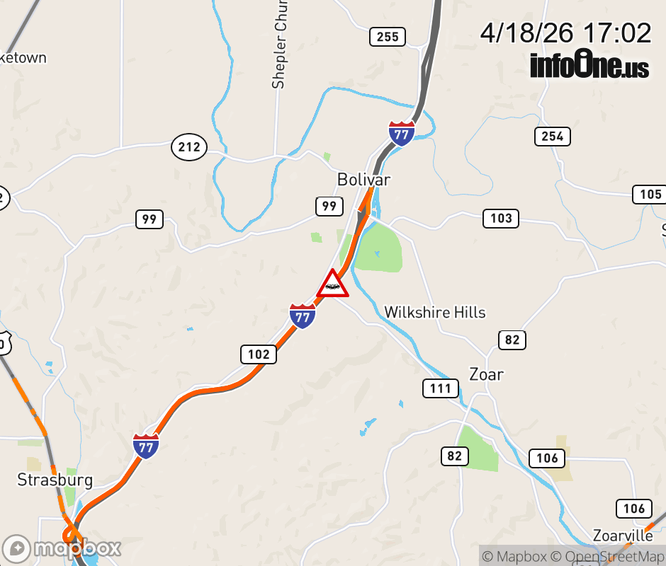 Expect lane closures on I-77 South beyond SR-212/Zoar/Bolivar, due to a crash. ![]() |