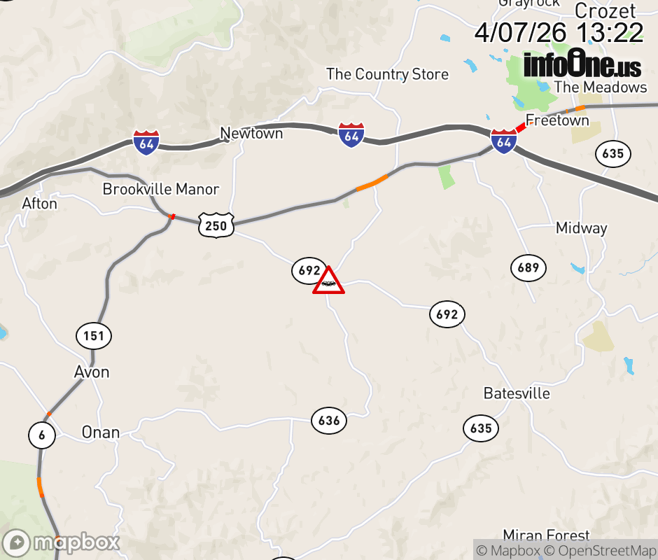 On Rt. 692 in the County of Albemarle, in the vicinity of Ortman Rd; Rt. 691N/S (Albemarle County), motorists can expect delays due to a vehicle crash. All east lanes are closed. All west lanes are closed. Updated: Tue 4/7/26 1:22 PM EDT ![]() Updated: Tue 4/7/26 1:22 PM EDT |
