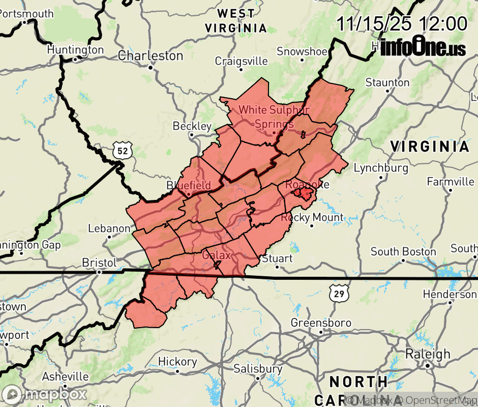Canceled 11/15/25 7:07 PM Wind Advisory issued November 15 at 11:59AM EST until November 16 at 12:00PM EST by NWS Blacksburg VA * WHAT... West winds 15 to 25 mph with gusts up to 50 mph expected. * WHERE... Portions of northwest North Carolina, southwest and west central Virginia, and southeast West Virginia. * WHEN... From midnight tonight to noon EST Sunday. * IMPACTS... Gusty winds will blow around unsecured objects. Tree limbs could be blown down and a few power outages may result. ![]() |