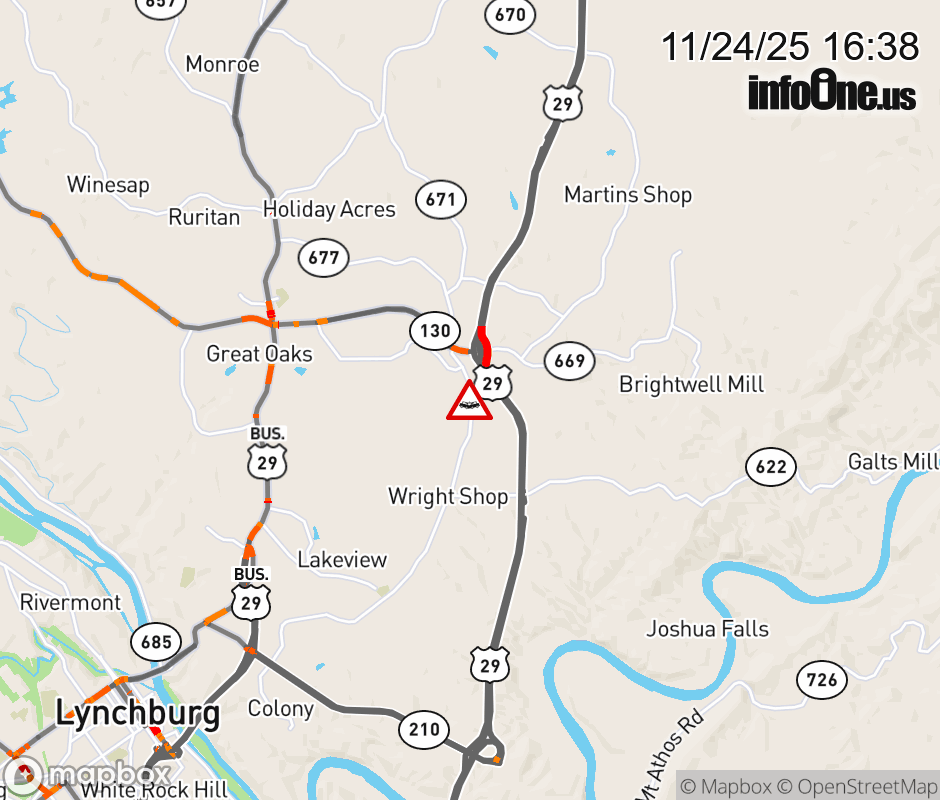 On Rt. 677 North in the County of Amherst, in the vicinity of Jabo Ln; Rt. 1350E/W (Amherst County), motorists can expect delays due to a vehicle crash. Lane closures exist. ![]() |