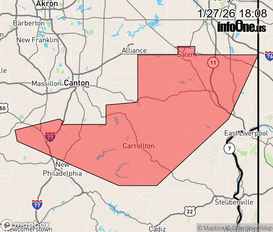 Canceled 1/27/26 6:43 PM Snow Squall Warning issued January 27 at 6:06PM EST until January 27 at 6:45PM EST by NWS Pittsburgh PA The National Weather Service in Pittsburgh has issued a * Snow Squall Warning for... Carroll County in east central Ohio... Columbiana County in east central Ohio... Northwestern Jefferson OH County in east central Ohio... Northern Tuscarawas County in east central Ohio... * Until 645 PM EST. * At 606 PM EST, a dangerous snow squall was located along a line from 16 miles north of Salem to near Strasburg, or along a line from 16 miles north of Salem to 10 miles northwest of Dover, moving east at 30 mph. HAZARD...Intense bursts of heavy snow and gusty winds leading to blowing snow and rapidly falling visibility to less than one-quarter mile. Wind gusts up to 35 mph. SOURCE...Radar indicated. IMPACT...Travel will become difficult and potentially dangerous within minutes. * Locations impacted include... New Philadelphia, Dover, Salem, Columbiana, East Palestine, Carrollton, Lisbon, Strasburg, Leetonia, New Waterford, Augusta, Salineville, Malvern, Bolivar, Mineral City, Bergholz, Hanoverton, Bowerston, Dellroy and Sherrodsville. This includes Interstate 77 in Ohio between mile markers 85 and 94. ![]() |