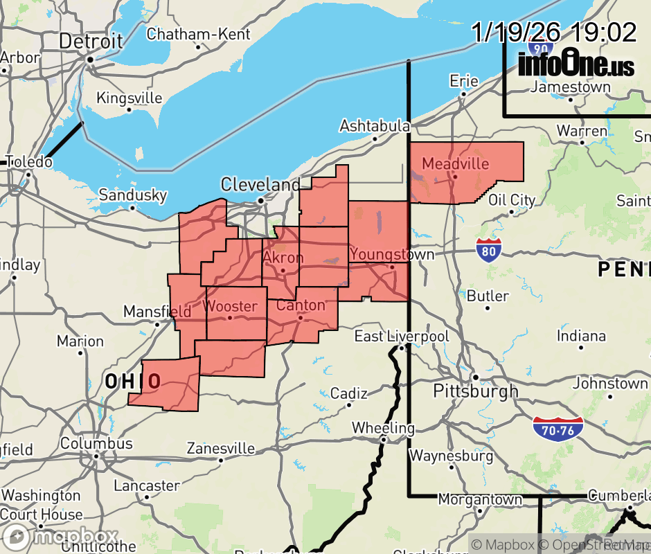 Canceled 1/20/26 3:19 AM Cold Weather Advisory issued January 19 at 7:00PM EST until January 20 at 12:00PM EST by NWS Cleveland OH * WHAT... Very cold wind chills as low as 15 below. * WHERE... Portions of north central and northeast Ohio and northwest Pennsylvania. * WHEN... Until noon EST Tuesday. * IMPACTS... The cold wind chills as low as 15 below zero could result in hypothermia if precautions are not taken. ![]() |