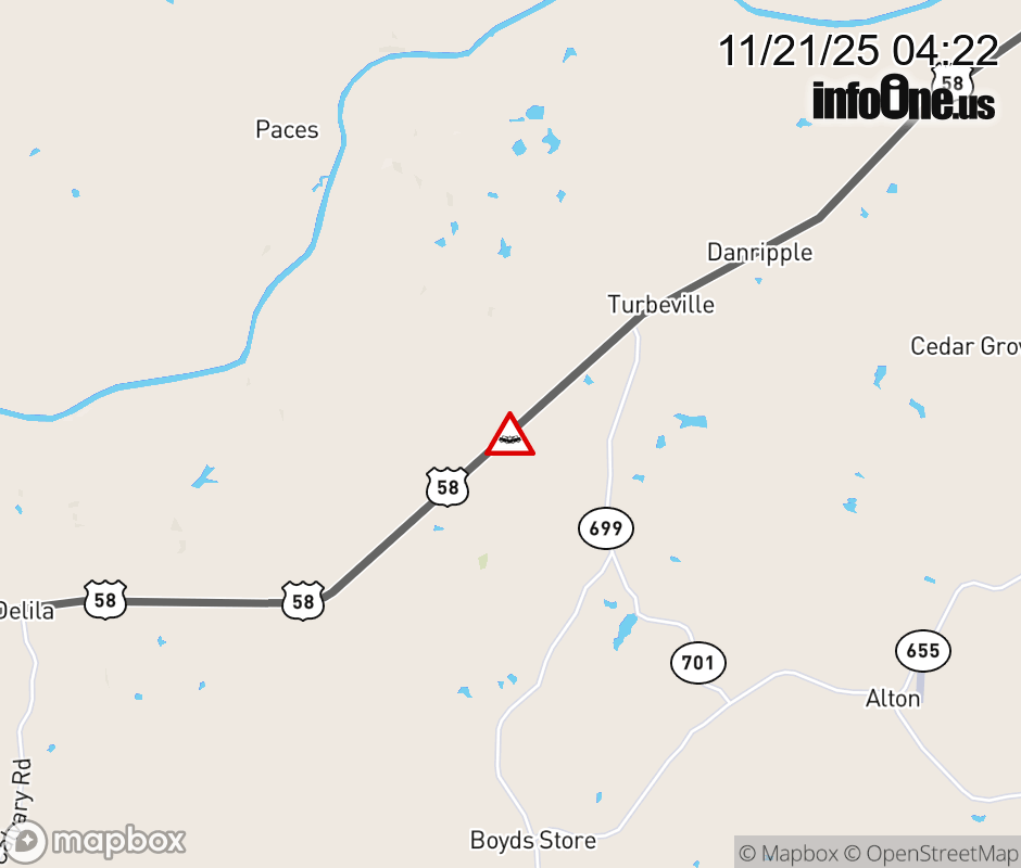 On US-58 in the County of Halifax, in the vicinity of Piney Grove Rd; Rt. 751E/W (Halifax County), motorists can expect delays due to a tractor trailer crash. The east right lane and right shoulder are closed. Updated: Fri 11/21/25 4:22 AM EST ![]() Updated: Fri 11/21/25 4:22 AM EST |