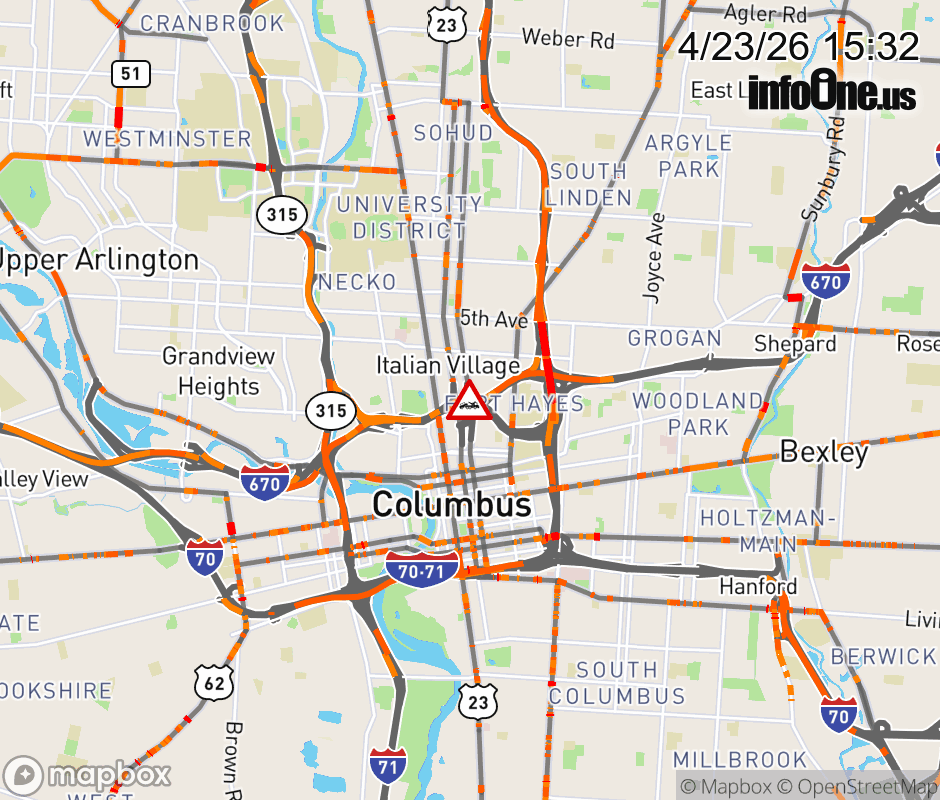 The right lane is blocked on I-670 West at US 23 North/Fourth St, due to a disabled vehicle. Updated: Thu 4/23/26 3:32 PM EDT ![]() Updated: Thu 4/23/26 3:32 PM EDT |