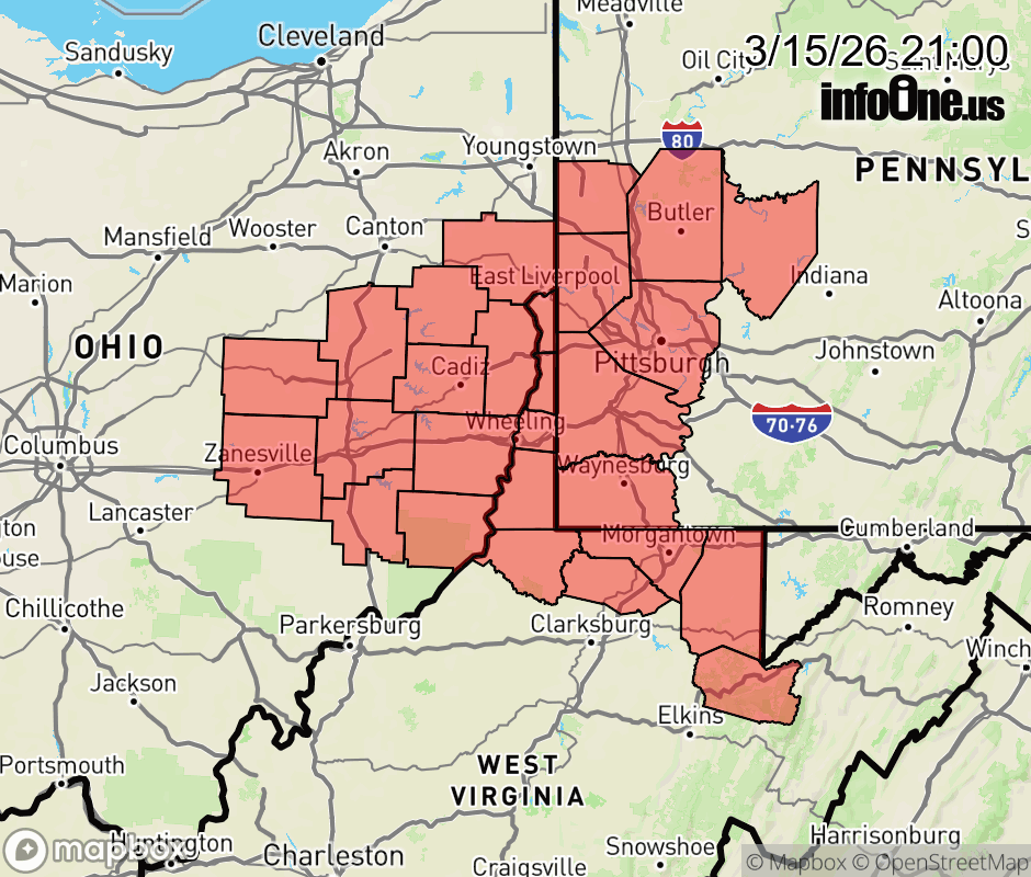 Canceled 3/16/26 3:05 AM Wind Advisory issued March 15 at 8:58PM EDT until March 16 at 11:00AM EDT by NWS Pittsburgh PA * WHAT... South winds 15 to 25 mph with gusts up to 50 mph expected. * WHERE... Portions of east central Ohio, southwest and western Pennsylvania, and northern and the northern panhandle of West Virginia. * WHEN... From midnight tonight to 11 AM EDT Monday. * IMPACTS... Gusty winds will blow around unsecured objects. Tree limbs could be blown down and a few power outages may result. ![]() |