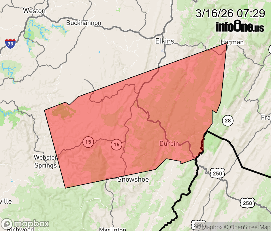Canceled 3/16/26 8:00 AM Special Weather Statement issued March 16 at 7:28AM EDT by NWS Charleston WV At 728 AM EDT, Doppler radar was tracking a strong thunderstorm 7 miles southeast of Holly River State Park, or 10 miles northeast of Webster Springs, moving northeast at 55 mph. HAZARD...Wind gusts up to 50 mph. SOURCE...Radar indicated. IMPACT...Gusty winds could knock down tree limbs and blow around unsecured objects. Locations impacted include... Mill Creek, Dailey, Holly River State Park, Mingo, Durbin, Huttonsville, Monterville, Cheat Bridge, Bartow, Slaty Fork, Glady, Helvetia, Pickens, Waneta, Hacker Valley, Valley Head, Bergoo, and Boyer. ![]() |