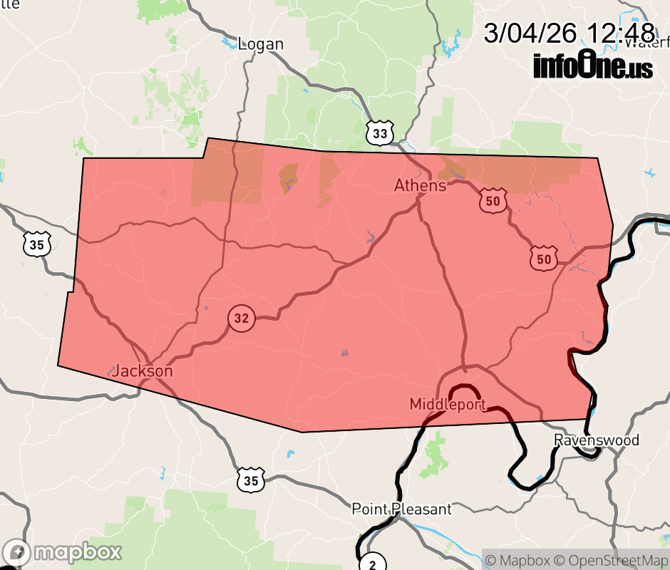 Canceled 3/4/26 12:59 PM Flood Warning issued March 4 at 12:47PM EST until March 4 at 1:30PM EST by NWS Charleston WV * WHAT... Flooding caused by excessive rainfall continues. * WHERE... Portions of southeast Ohio, including the following counties, Athens, Gallia, Jackson, Meigs, Vinton and Washington and western West Virginia, including the following county, Mason. * WHEN... Until 130 PM EST. * IMPACTS... Flooding of rivers, creeks, streams, and other low-lying and flood-prone locations is imminent or occurring. * ADDITIONAL DETAILS... - At 1245 PM EST, Doppler radar indicated heavy rain across the warned area. Flooding is ongoing or expected to begin shortly in the warned area. Between 1 and 2 inches of rain have fallen. - Additional rainfall amounts up to 0.5 inches are possible in the warned area. - Some locations that will experience flooding include... Athens, Jackson, Wellston, Pomeroy, Mcarthur, Albany, Racine, Coolville, Rutland, Lake Hope State Park, Forked Run State Park, New Haven, Mason, Tuppers Plains, Middleport, Chester, Hamden, Syracuse, Hartford City and Coalton. - http://www.weather.gov/safety/flood ![]() |
