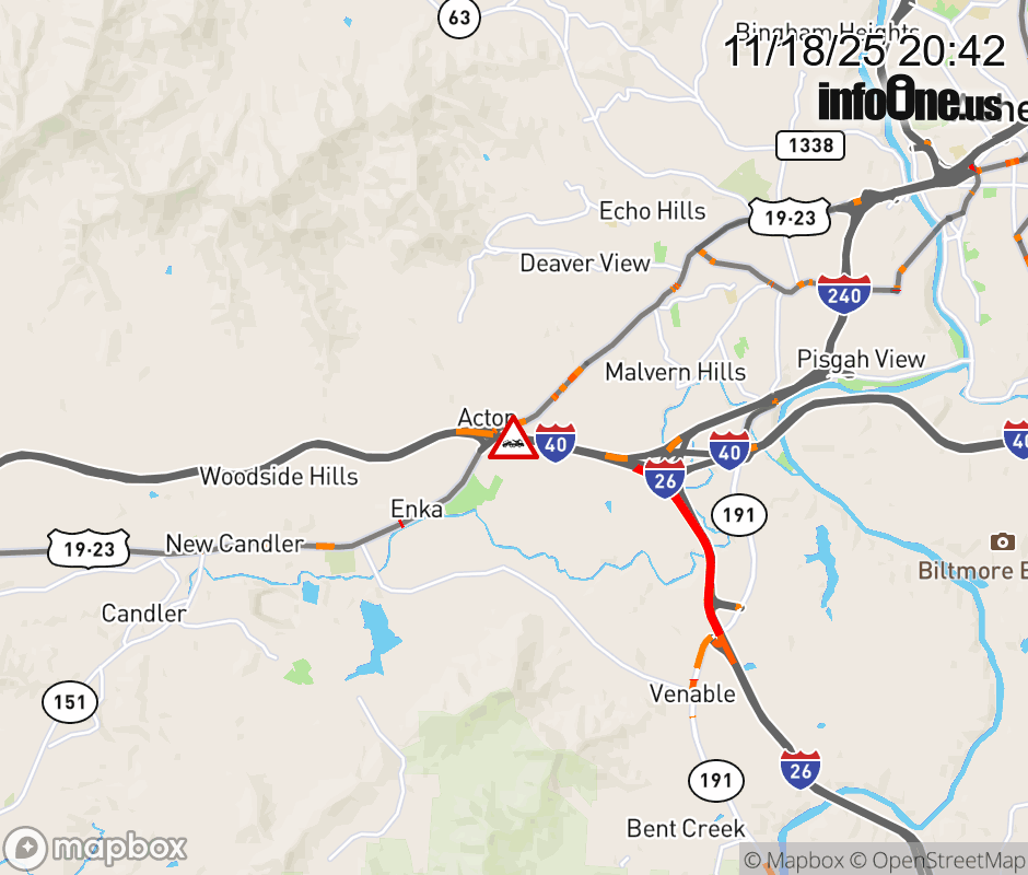 The left lane is closed near Exit 44, US 19/23/74 ALT (Smokey Park Highway). ![]() |