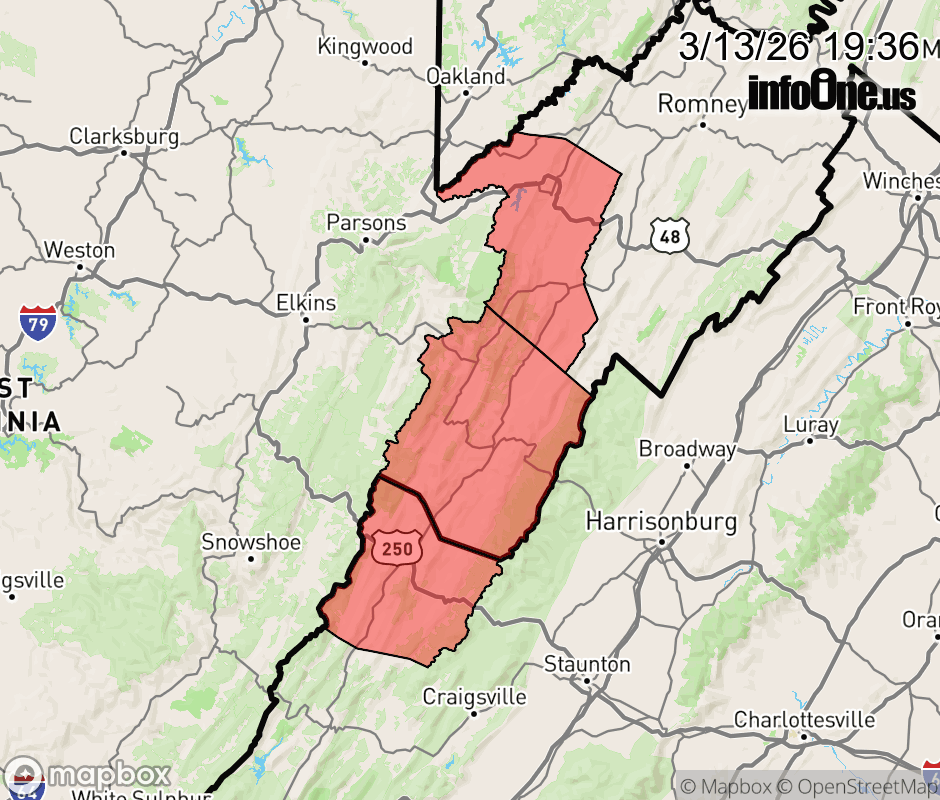 Canceled 3/13/26 8:16 PM High Wind Warning issued March 13 at 7:36PM EDT until March 14 at 2:00AM EDT by NWS Baltimore MD/Washington DC * WHAT... West winds 25 to 35 mph with gusts up to 65 mph. * WHERE... In Virginia, Western Highland County. In West Virginia, Western Grant and Western Pendleton Counties. * WHEN... Until 2 AM EDT Saturday. * IMPACTS... Damaging winds will blow down trees and power lines. Widespread power outages are expected. Travel will be difficult, especially for high profile vehicles. ![]() |