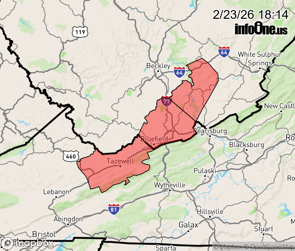 Canceled 2/23/26 11:37 PM Winter Storm Warning issued February 23 at 6:12PM EST until February 24 at 1:00AM EST by NWS Blacksburg VA * WHAT... Heavy snow. Additional snow accumulations up to one inch. Winds gusting as high as 35 mph. * WHERE... In Virginia, Tazewell County. In West Virginia, Mercer and Summers Counties. * WHEN... Until 1 AM EST Tuesday. * IMPACTS... Plan on slippery road conditions. ![]() |