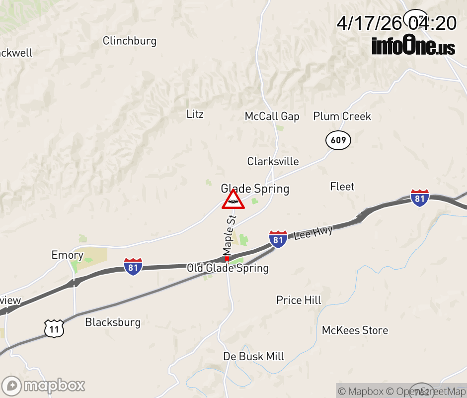 On Rt. 609 East in the County of Washington, in the vicinity of Old Mill Rd; Rt. 750N/S (Washington County), motorists can expect delays due to a vehicle crash. Lane closures exist. Updated: Fri 4/17/26 4:20 AM EDT ![]() Updated: Fri 4/17/26 4:20 AM EDT |