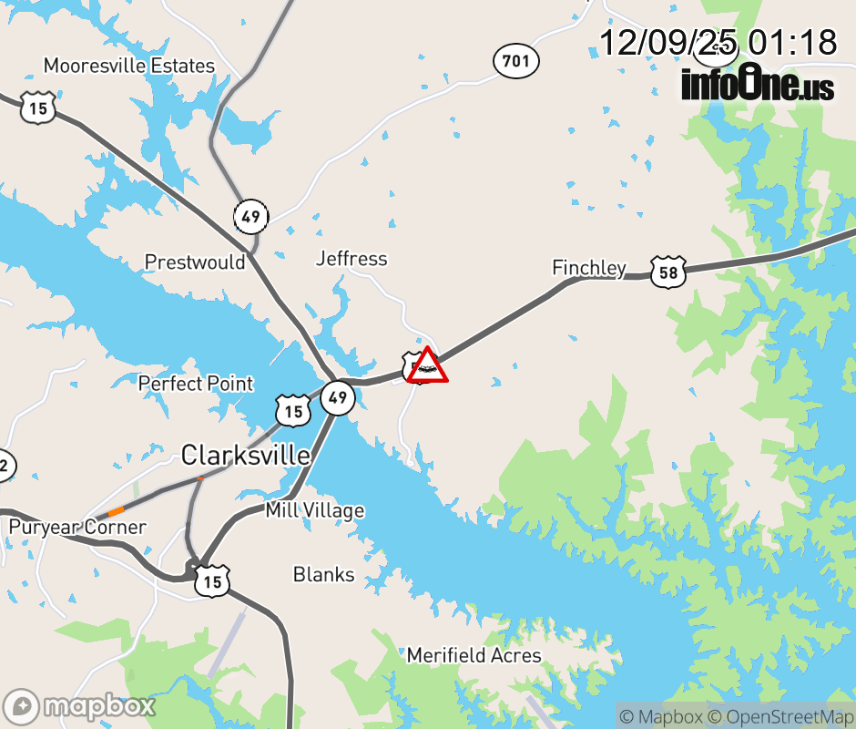 On US-58 in the County of Mecklenburg, in the vicinity of Arbor Ln; Highway Fifty-Eight; Jeffress Rd, motorists can expect delays due to a vehicle crash. The west right lane and right shoulder are closed. Updated: Tue 12/9/25 1:18 AM EST ![]() |